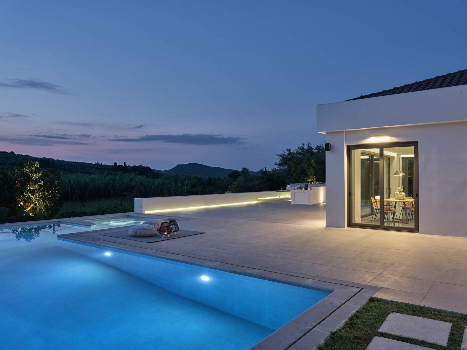 The surrounding area incorporating an extensive all-green garden and architectural arrangements dispersed around the centrally positioned swimming pool, is ideal for year round moments of leisure and social gatherings.